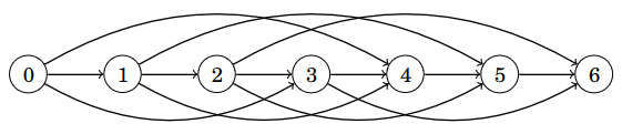 Tämä ongelma voidaan esittää verkkona, jossa jokainen solmu vastaa rahamäärää \(0,1,\dots,x\) ja solmusta \(a\) on kaari solmuun \(b\), jos rahamäärästä \(a\) pääsee yhdellä kolikolla rahamäärään \(b\). Kun kolikot ovat \([1,3,4]\) ja \(x=6\), verkko on seuraava: