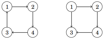 Esimerkiksi seuraavassa kuvassa vasemmassa verkossa on polku mistä tahansa solmusta mihin tahansa solmuun, mutta oikeassa verkossa ei ole esimerkiksi polkua solmusta \(2\) solmuun \(1\).