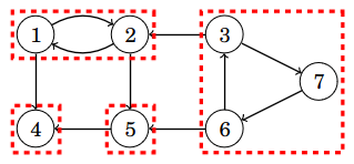 Tässä komponentit ovat \(A=\{1,2\}\), \(B=\{3,6,7\}\), \(C=\{4\}\) ja \(D=\{5\}\).