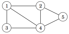 Verkko on yhtenäinen (connected), jos siinä on tasan yksi komponentti eli minkä tahansa kahden solmun välillä on reitti kaaria pitkin. Esimerkiksi seuraava verkko on yhtenäinen, koska sen ainoa komponentti on \(\{1,2,3,4,5\}\).