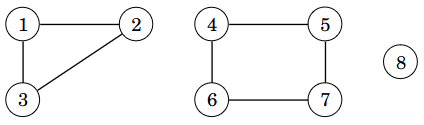 Verkon komponentti (component) sisältää solmut, jotka ovat yhteydessä toisiinsa kaaria pitkin. Esimerkiksi seuraavassa verkossa on kolme komponenttia: \(\{1,2,3\}\), \(\{4,5,6,7\}\) ja \(\{8\}\).