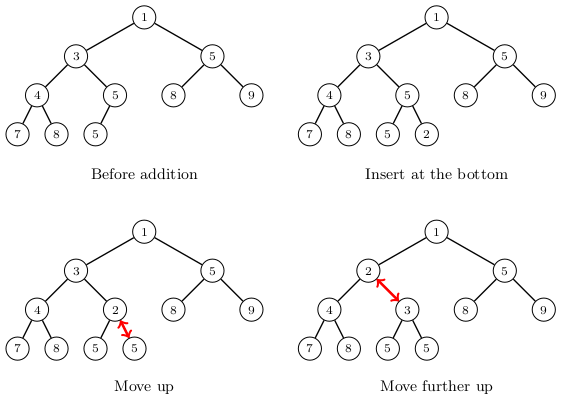 The following picture shows how the element \(2\) is added to the example heap. It is first inserted at the bottom and then lifted up two levels.