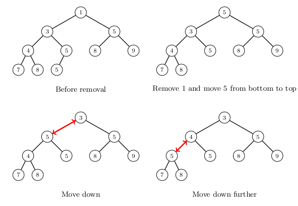 The following picture shows how the element \(1\) is removed from the heap. It is first replaced by the element \(5\), which is then moved down.
