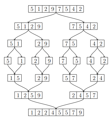 The following picture illustrates merge sort on the list \([5,1,2,9,7,5,4,2]\).